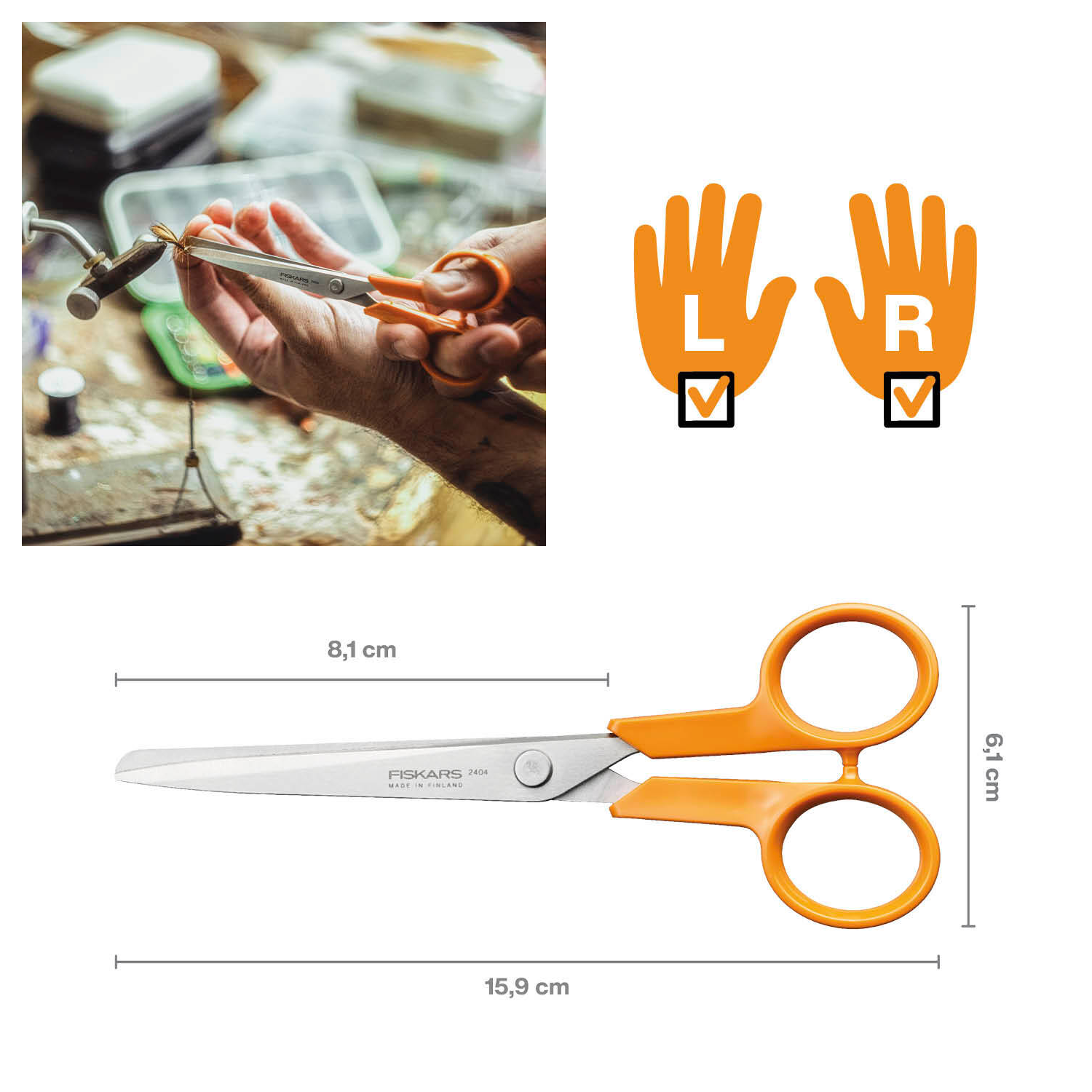 Stutt og nákvæm skæri fyrir alhliða heimilisnotkun. Skærin eru með sléttar eggjar fyrir nákvæmari klippingar. Þau eru gerð fyrir bæði hægri og vinstri handar notkun og fyrir hendur af misjafnri stærð. Notendavæn handföng úr hágæða plastefni.