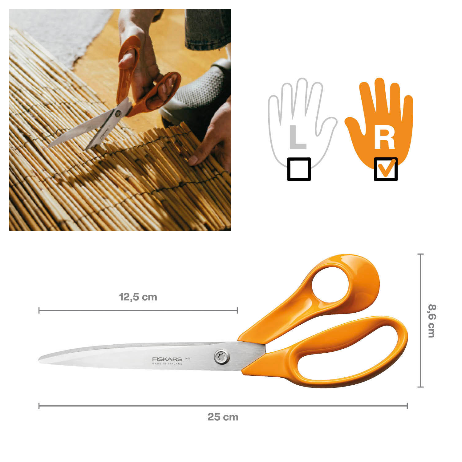 Frábær skæri til að klippa þykk og þunn efni og henta frábærlega sem almenn heimilisskæri. Skærin eru með sléttar eggjar fyrir nákvæmari klippingar. Þau eru gerð fyrir hægri handar notkun og fyrir hendur af misjafnri stærð. Notendavæn handföng úr hágæða plastefni.