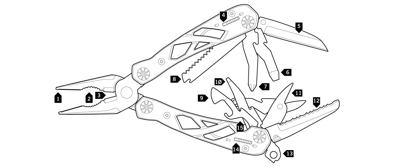 Undir áhrifum af útliti brúa í heimabæ Gerber, Portland, Oregon var Suspension™ fjölnotaverkfærið hannað með höldum sem eru opin en hafa samt ótrúlegan styrk vegna byggingarlags. Þetta flotta verkfæri er með töng sem opnast með krafti frá innbyggðri fjöður, SAF.T.PLUS™ læsingum til að læsa verkfærum þegar þau eru í notkun, hníf með sléttri egg, hníf með rifflaðri egg, grófri sög og fleiru. Utan um verkfærið fylgir svo nylonhulstur með beltfestingu. Suspension™ inniheldur 12 mismunandi verkfæri.